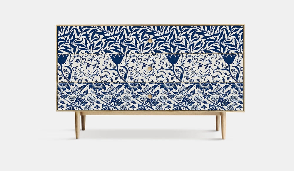 Despite what you may have come to believe, wallpaper is not just for the walls of your home! Covering furniture in wallpaper is a creative and cost-effective way to transform or update the look of your home decor, breathing new life into old or plain furniture pieces and giving them a personalised and stylish makeover. Whether you choose a bold, patterned wallpaper for a statement piece or a subtle, textured option for an understated elegance, the possibilities are endless. The process typically involves carefully measuring and cutting the wallpaper to fit the furniture’s surfaces, applying adhesive, and smoothing out any air bubbles or wrinkles. With some patience and creativity, you can achieve a unique and eye-catching aesthetic that adds character and charm to your living space while repurposing and upcycling furniture in an eco-friendly manner.