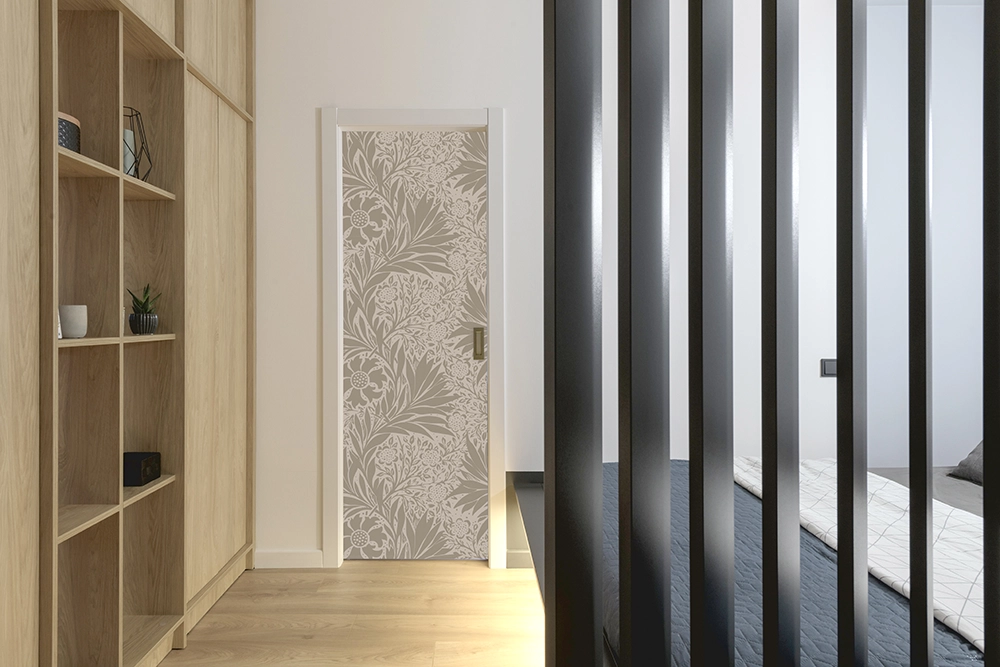 An underrated canvas in every home, we don’t often consider using these spaces to bring our artistic flair or personal style to life. Whether it’s a striking pattern, a whimsical illustration, or a burst of vibrant colour, applying wallpaper to your interior doors is a fantastic way to infuse your living spaces with warmth, charm, and personality. This technique works well when your wall colours are fairly neutral, allowing your uniquely adorned doors to stand out.