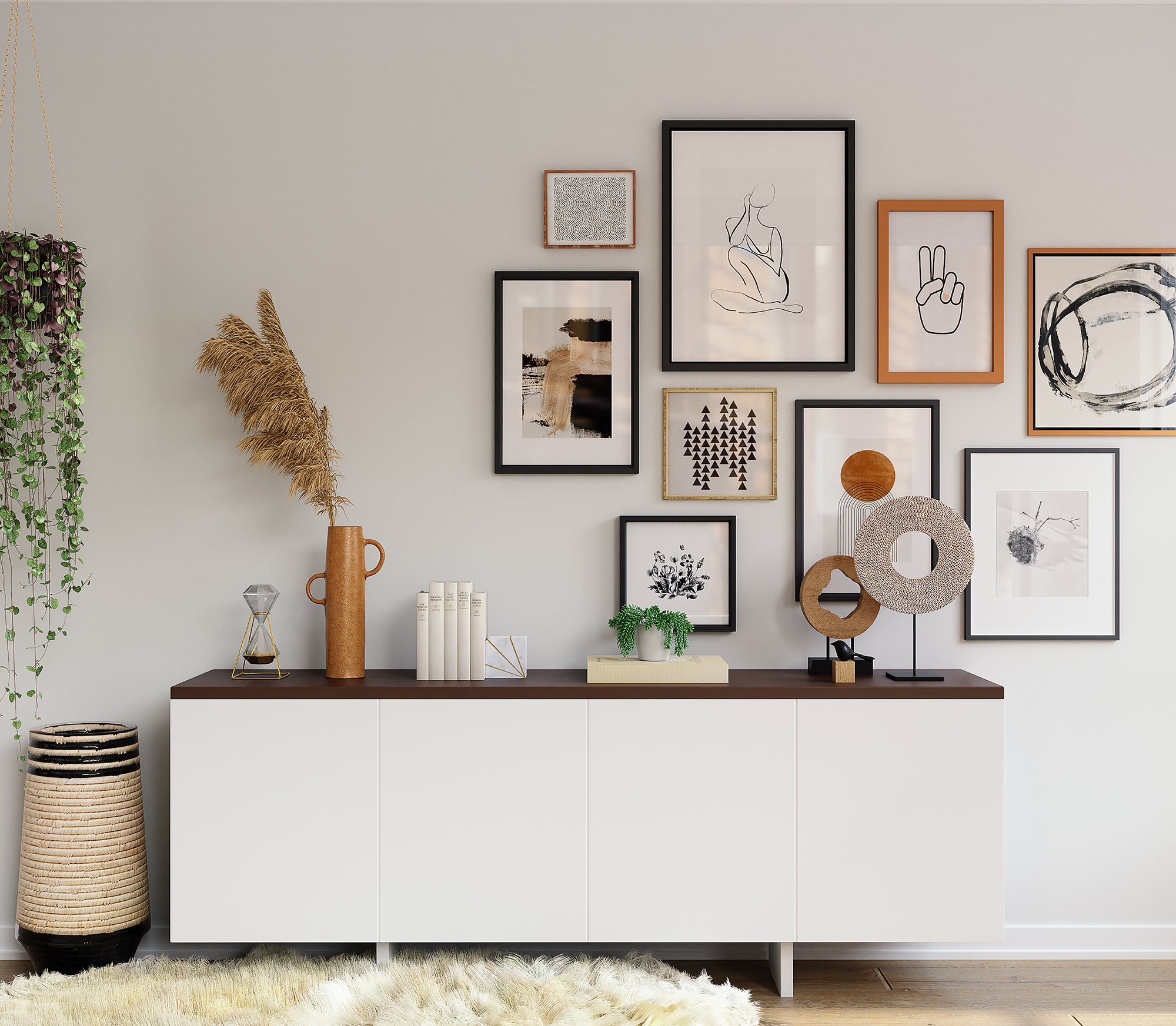 Don’t be afraid to play with unconventional heights and placements. The more items a gallery wall contains, the more loosely they can be placed. There are no set rules with wall layouts but a few simple guidelines should be followed within the layout. The most important guideline, which we will never disregard, is even spacing between frames. Try your best to keep the frames evenly spaced throughout for a polished look. Naturally, good frame height is around eye-height but a gallery wall layout normally calls for more unconventional hanging heights and spacing to utilise the entire wall area.