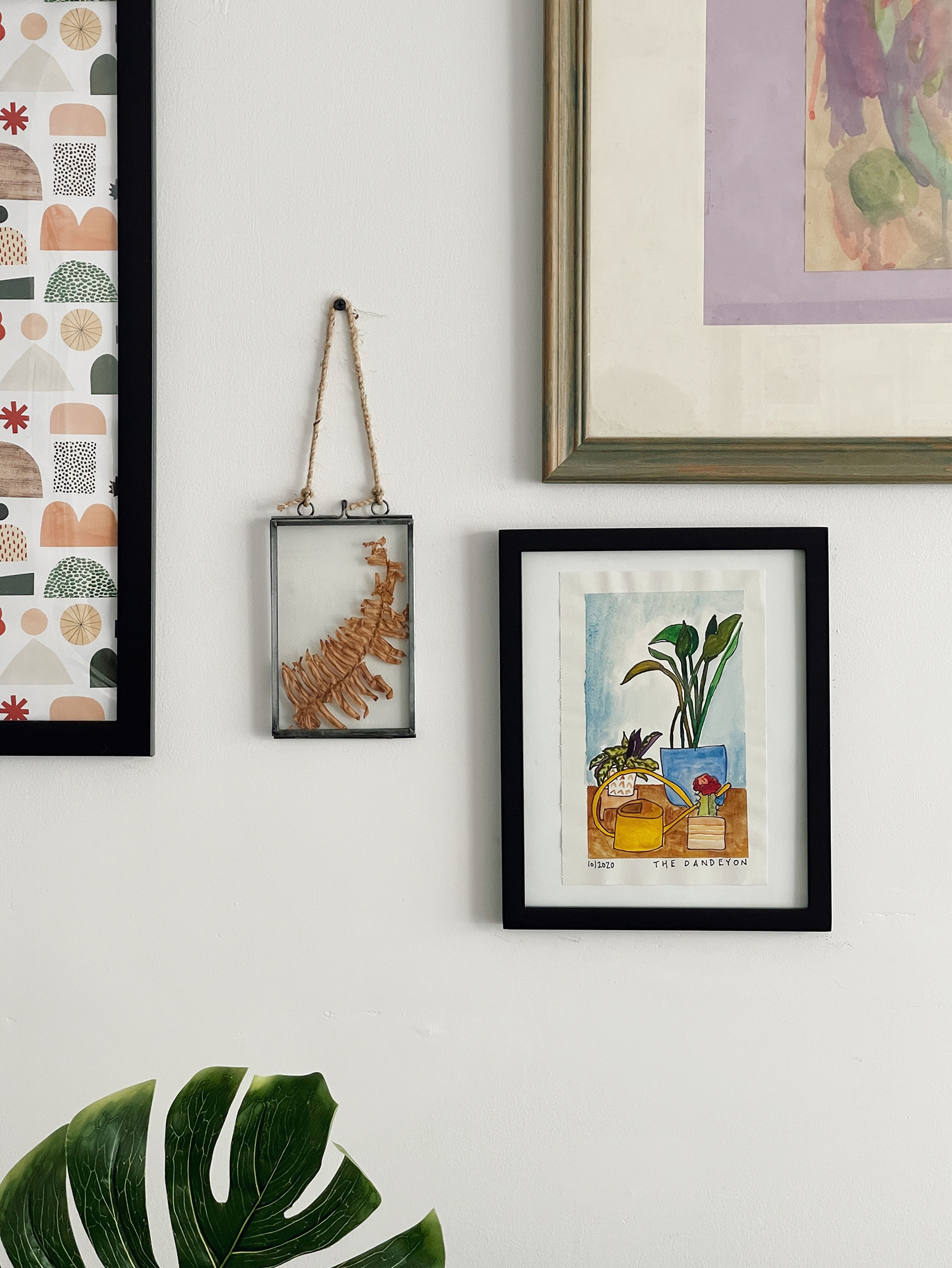 Your gallery wall is not limited to frames. Try to introduce unique and playful elements. Plants and other three-dimensional items can easily be added in between frames to add some texture and depth into your gallery wall. A good double-sided tape or nylon gut can be used to hang these items just as you would any frame. Empty frames, with no glass or backing boards, also add a sophisticated element to your walls. Something like a simple leaf adhered to the wall can be framed by an empty frame – this is a great way to upcycle old and vintage frames that are otherwise outdated and unusable.